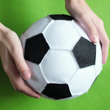 Этот мяч лично я сшила в классических цветах из фетра, но его можно также сшить и из флиса или из х/б ткани. Цвет футбольного мяча вы можете выбирать по своему усмотрению. Как варианты, его можно пошить в цвете государственного флага или любимого футбольного клуба. А на одном из многоугольников можно также вышить название, в таком случае этот мяч станет прекрасным сувениром-подарком.