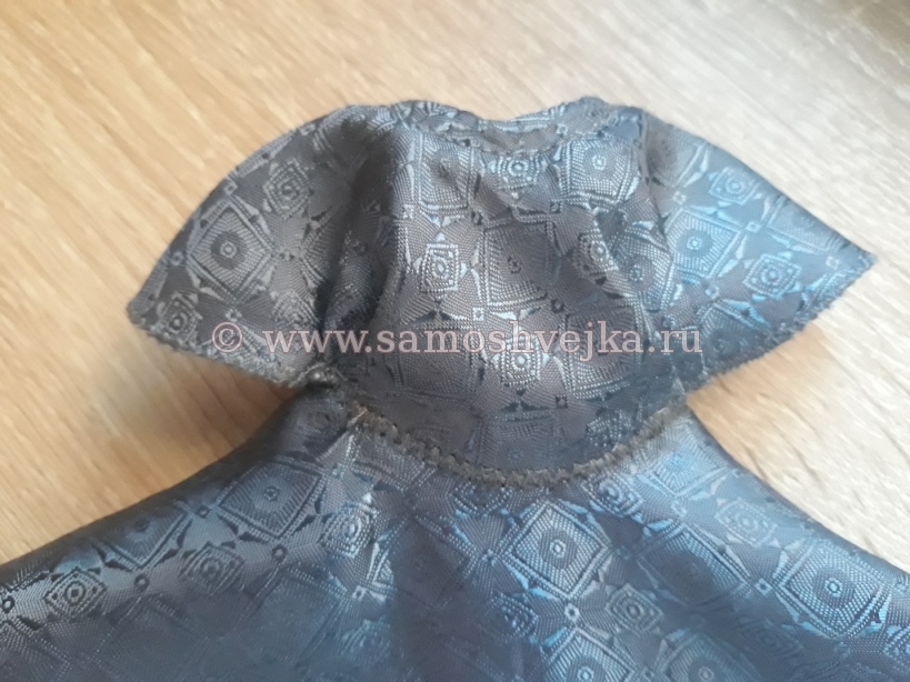 - Из кусочка ткани 12х12 см вырезают верхнюю часть плаща длиной 5 см, диаметр горловины 2 см. Деталь разрезают спереди для оформления застежки.