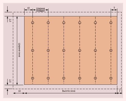Выкройка строится с учетом полученных размеров напусков. С изнаночной стороны сначала наносим отметки в местах прохождения складок и фиксируем их булавками. Следим за равномерным натяжением ткани, иначе изделие может перекосить. Обрабатываем боковые швы, одновременно формируя постоянные складки. Наносим разметку для прутиков и петель. Далее обрабатываем изделие по аналогии с изготовлением простой римской шторы.