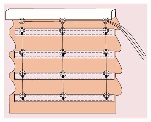 К кайме пришиваем петли-колечки для крепления шнура. Фиксируем штору на брусе с помощью липучки. Нарезаем нейлоновый шнур на отрезки необходимой длины и продеваем через все кольца, как показано на схеме ниже. Туго стягиваем шнуры и выводим их на одну сторону изделия. Формируем и фиксируем красивые складки.