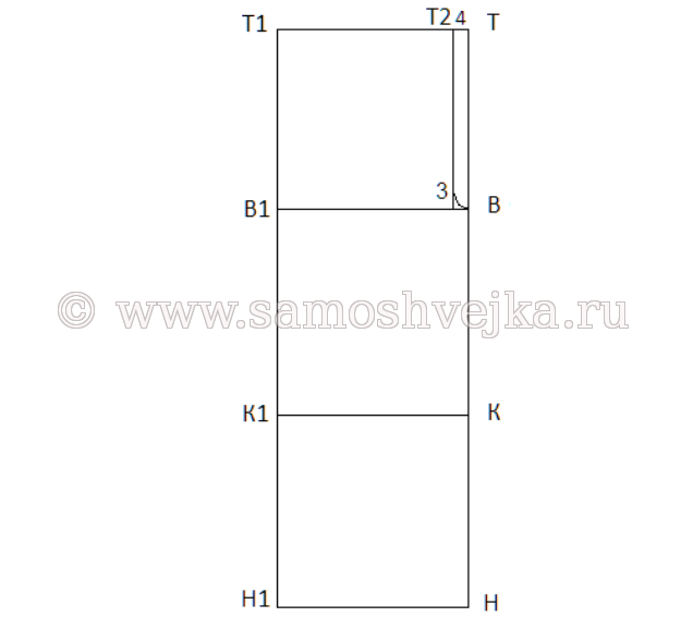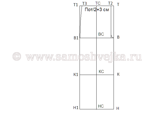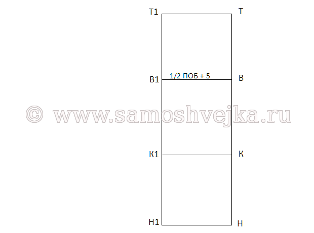 От точки Т влево отложить мерку ½ ПОБ+5 см, отметить поставить точку Т1.