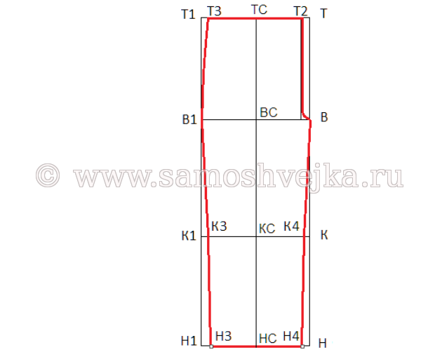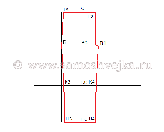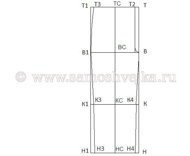 Отрезок ВВ1 делим пополам, отмечаем точку ВС. Через эту точку вверх и вниз проводим линию. На пересечении ставим точки: ТС, КС, НС. Это – линия заутюжки, т. е. середина передней половинки брюк.