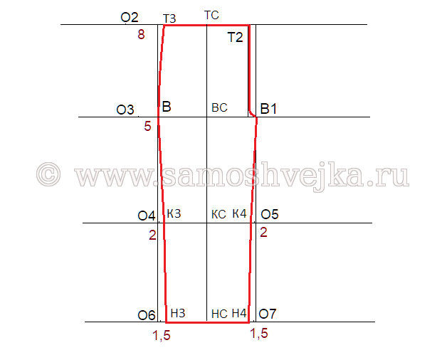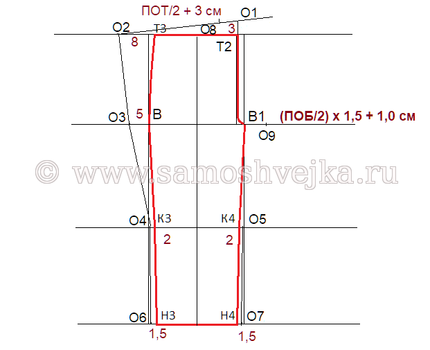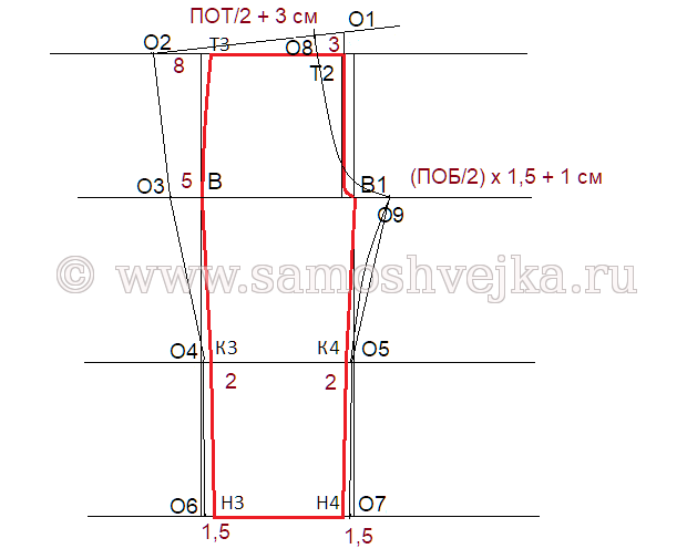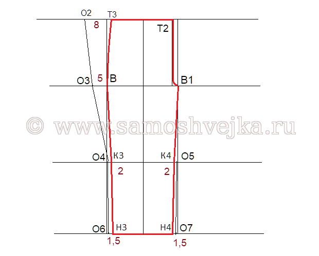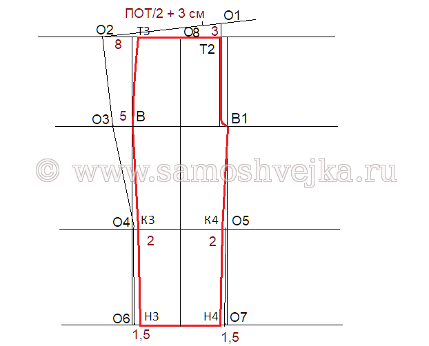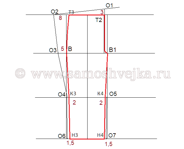 От боковой точки В по линии сидения откладываем 5 см, ставим точку О3: