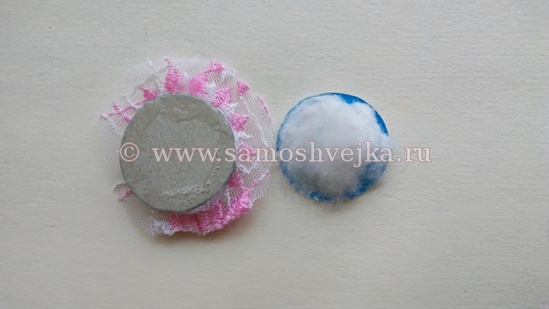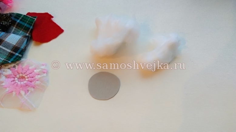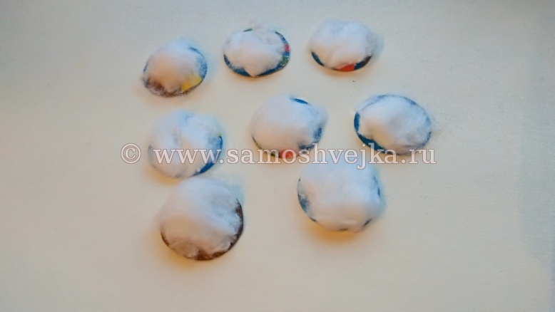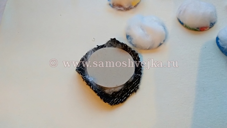 На картонную кругляшку наклейте кусочек ваты или синтепона. Придавите мягкий материал, зажав ватку в шарик.