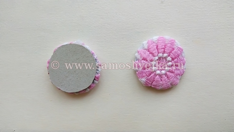 Приклейте с обратной стороны край ткани, а сверху замаскируйте еще одним картонным кругом.